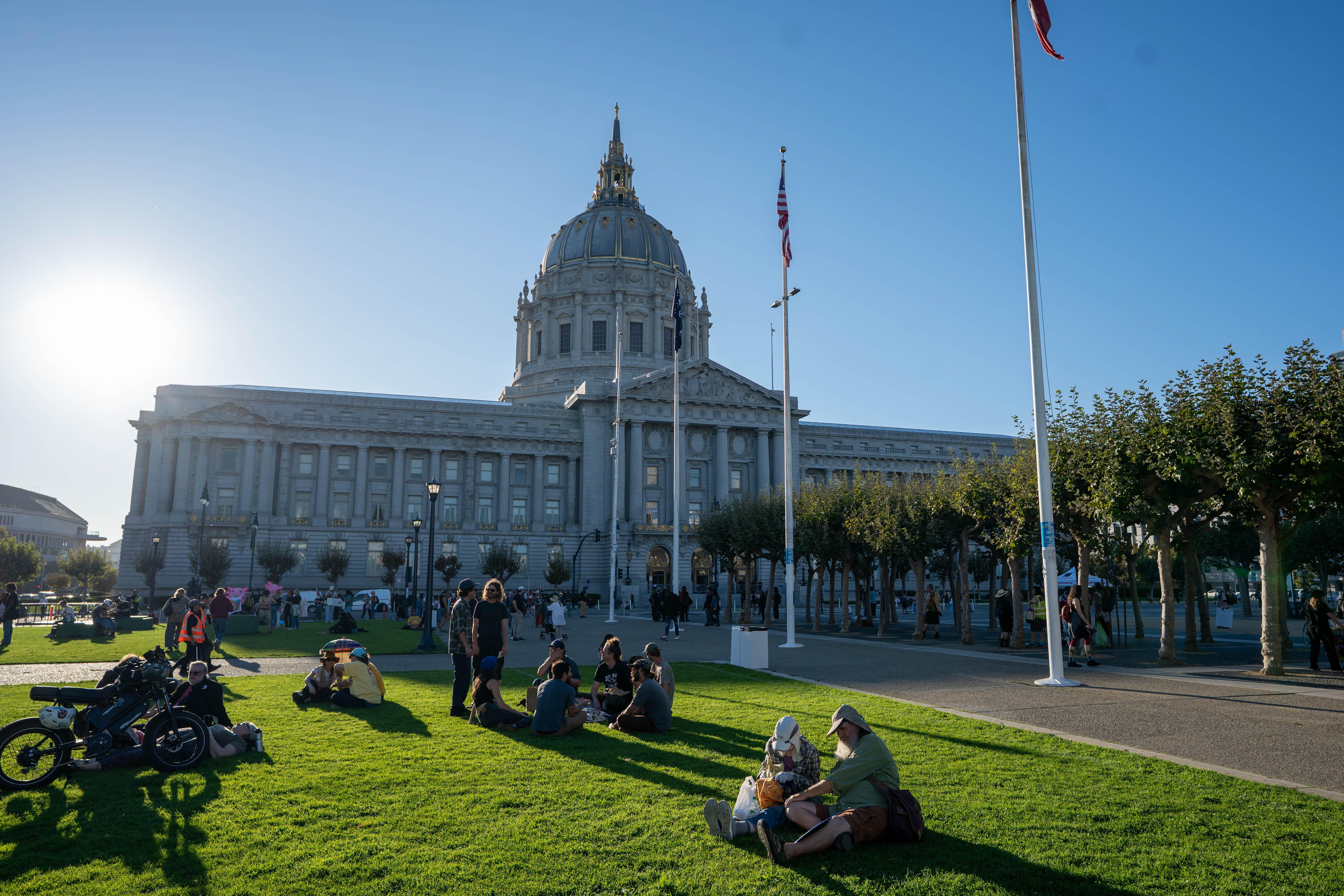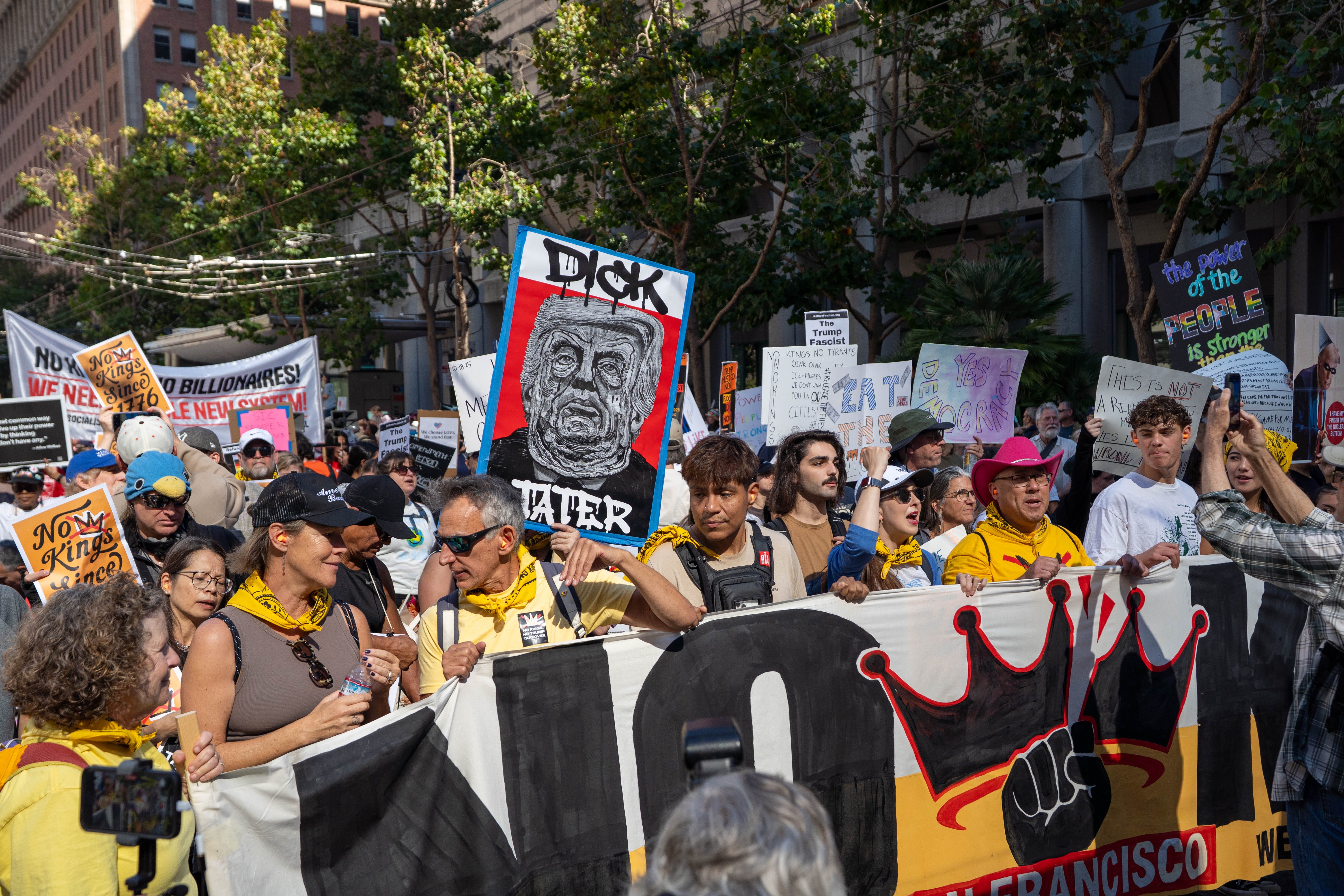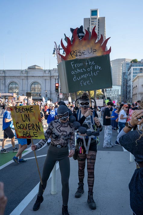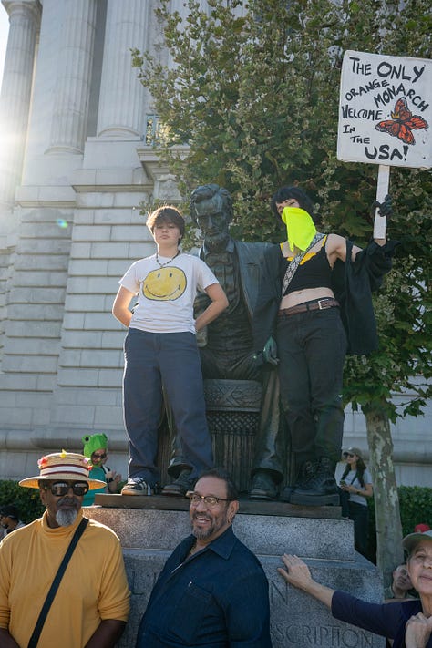 Before the march from the Ferry Building to City Hall, protesters gathered on the beach to form human signs spelling out “NO KINGS” and “YES ON 50,” a reference to Proposition 50, which would allow the state legislature to gerrymander its own districts in response to Texas and other states trying to redistrict theirs. The crowd’s politics were as varied as the costumes, but the dominant sentiment was unmistakable, a broad, simmering anger at the lawlessness of the current president. Tens of thousands turned out, young, old, lots of old, workers, teachers, families with placards, anarchists, furries, a woman with birds on her head, Black Israelites, and hundreds wearing what has become the era’s chosen emblem of defiance: the inflatable frog suit. The media were there in droves as were some very SF personalities.