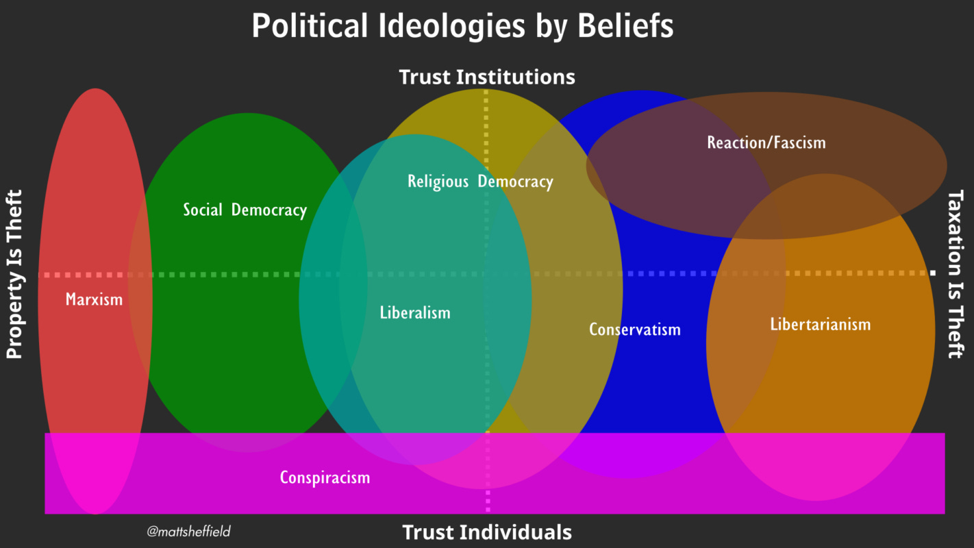 One of the topics discussed in this episode (at 19:40) is how political ideologies overlap with each other and should not be understood on a simple left-to-right line. The two charts referenced in the discussion are reproduced below.