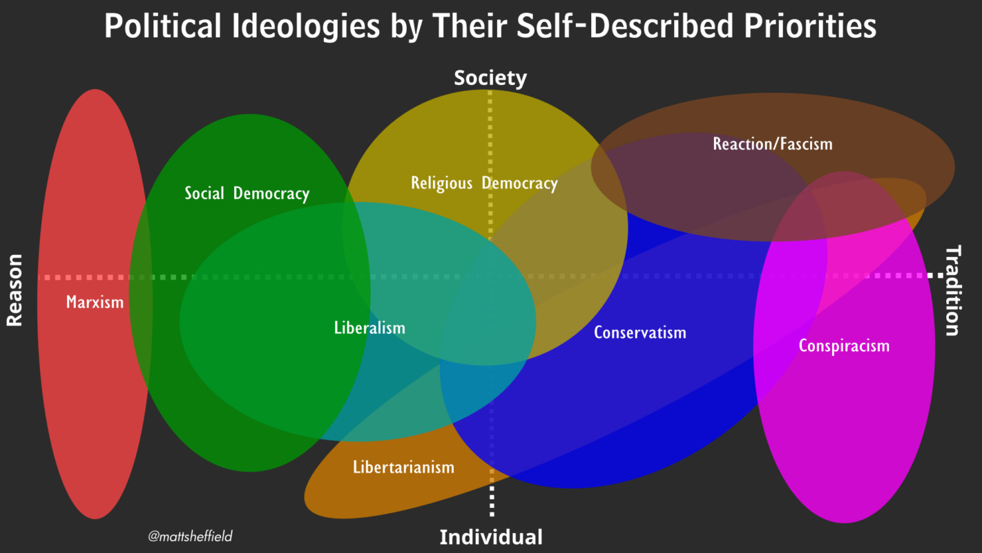 The second graph shows how political ideologies prioritize goals. The X-axis shows the how adherents of various ideologies value reason versus tradition, with more “right-wing” ideologies preferring tradition and “left-wing” ones favoring reason. (Whether people are actually advancing traditional or reasonable ideas is not what the graph indicates, only what adherents think they are doing.) The Y-axis in the graph shows whether ideologies value society or the individual more.