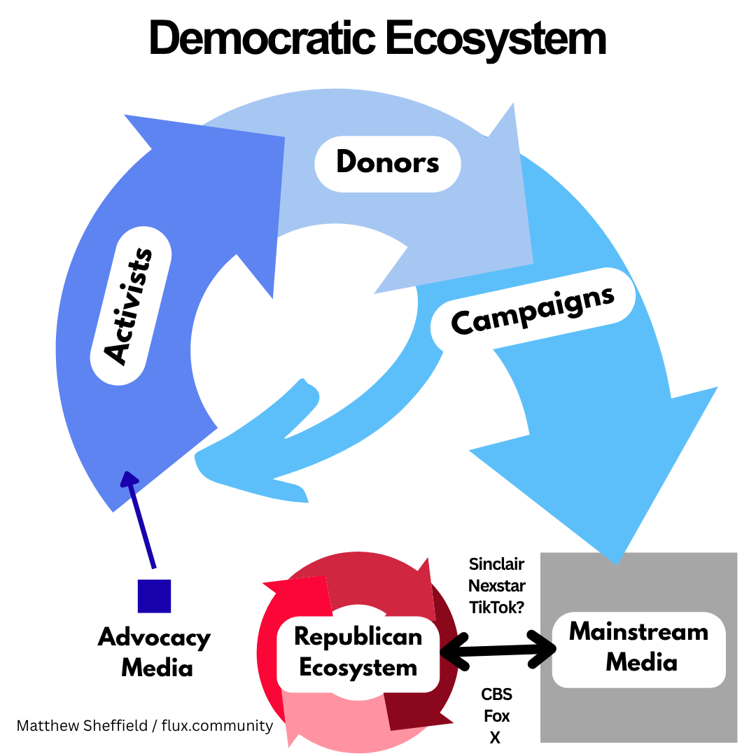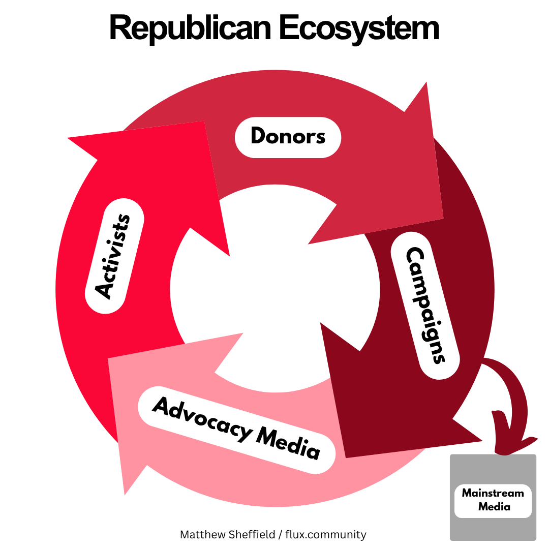 In the graphic above, Republican donors give money to campaigns, which then spend it on advertising with advocacy media and mainstream media. The money they receive enables them to maintain and expand their operations to create new reactionary activists. These activists then become donors to start a new round of the cycle. Aside from some small fund leakage to mainstream media outlets to motivate or attract uncommitted voters, most Republican money is kept within the ecosystem.