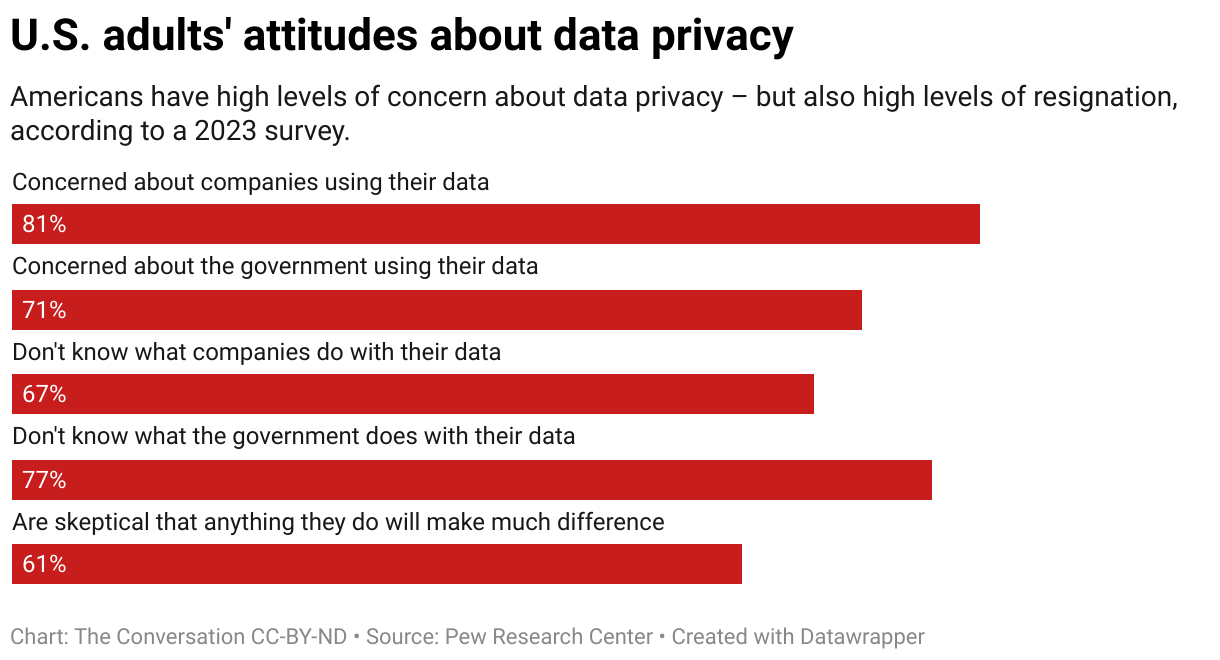 But most people likely shrugged and moved on with their day. Why is that? It’s not that people don’t care. According to a 2023 Pew Research Center survey, 81% of American adults said they were concerned about how companies use their data, and 71% said they were concerned about how the government uses their data.