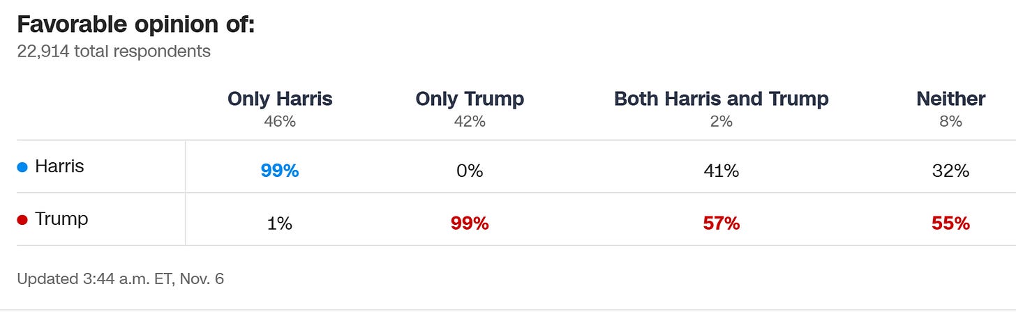 According to the survey, both candidates did exactly the same among people who liked them, 99 percent of voters who liked Trump voted for him, ditto for Harris.